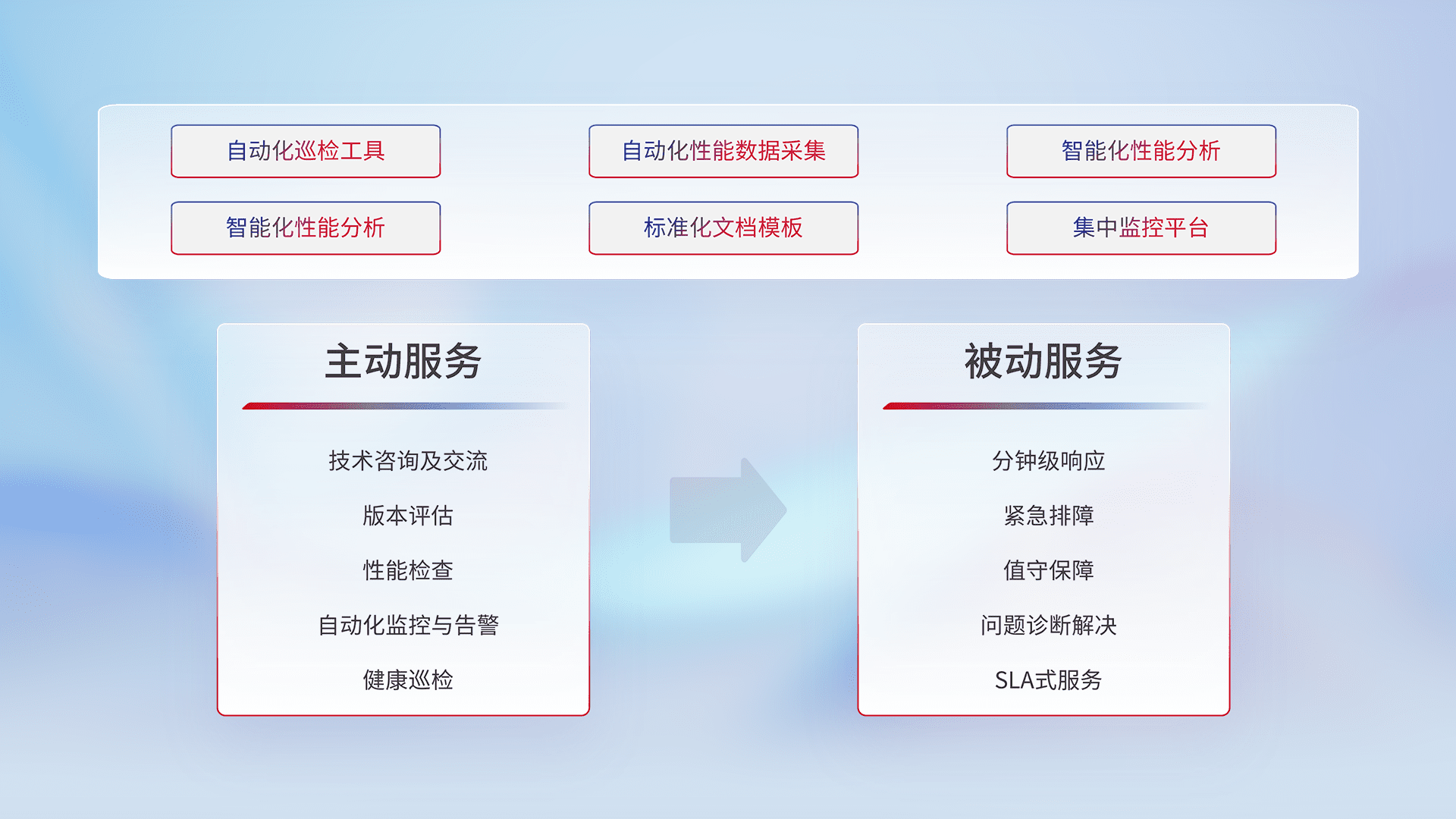 智能化工具和标准化文档,,,,保障服务质量,,,提供主动服务(包含技术咨询、、版本评估、、性能检查、、、自动化监控与告警、、健康巡检)和被动服务包含(分钟级响应、、、紧急排障、、值守保障、、、、问题诊断解决、、SLA服务)。。。。