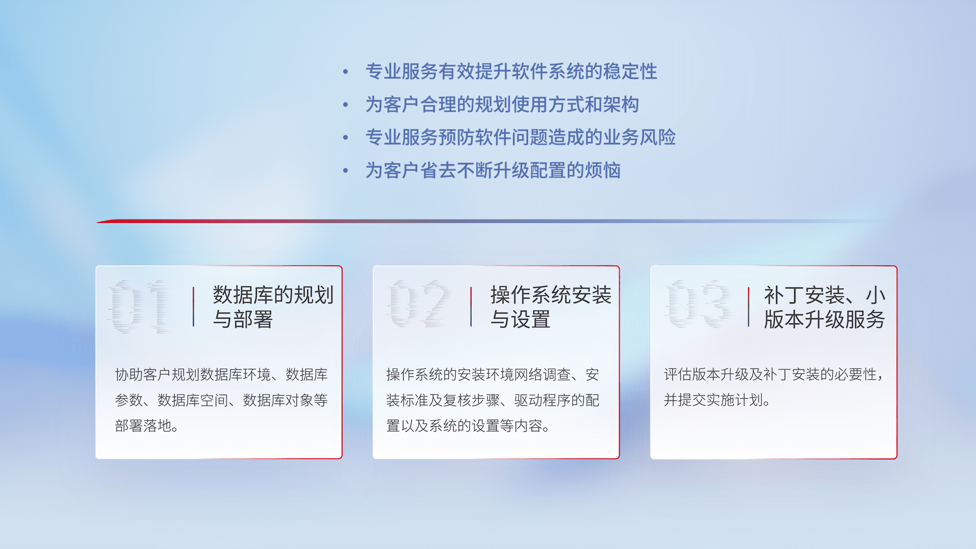 为客户提供软件规模升级、、、快速部署、、按需配置的专业服务,,,,从数据库的规划与部署到操作系统的安装与设置,,,,再到补丁安装和小版本升级提供支持。。。